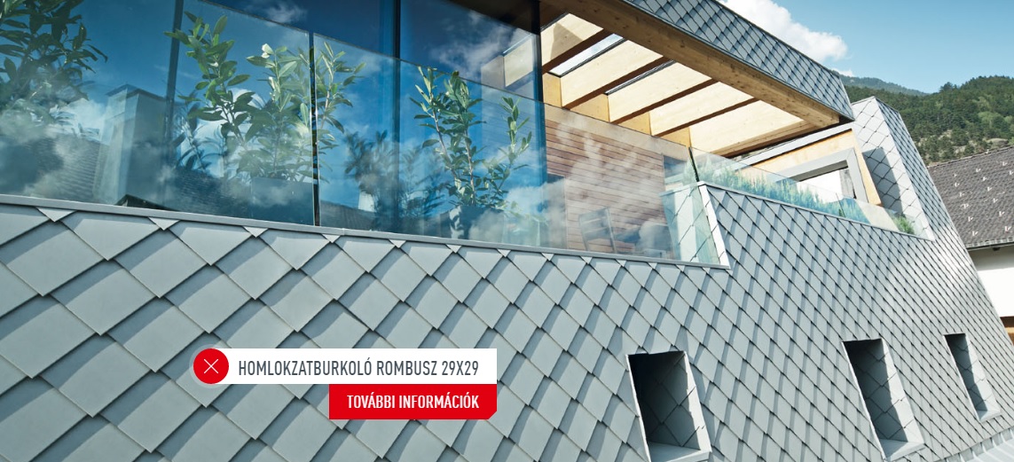 A megnövelt felületű szerkezet szabad mozgásteret biztosít a modern hangsúlyok és hagyományos forma között, emellett pedig rendkívüli az ellenálló-képessége az időjárási hatásokkal szembeni. Az újszerű formatervezésű PREFA tetőfedő rombusz kezelés során tapasztalt maximális hatékonysága, valamint minimális súlya lehetővé teszik a tető- és homlokzatelemek költségkímélő, gyors szerelését és már 12o-os hajlásszögű tető esetén is beépítető, persze megfelelő alszerkezetre A rombuszelemek homlokzatburkolatként alkalmazva modern struktúrájú homlokzatot eredményeznek, amely gazdaságos, és egyben tartós, illetve karbantartás-mentessége miatt esztétikus megjelenést biztosít az épületnek.