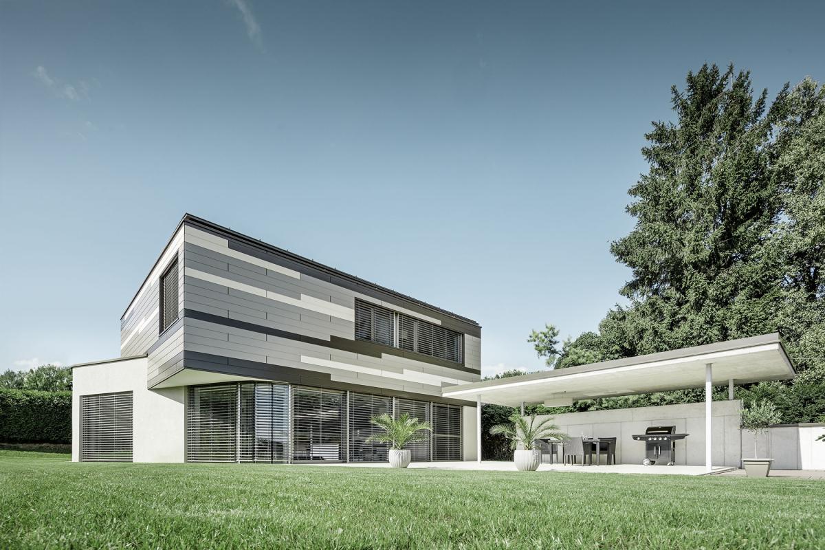 Peter Blineder, negyedik generációs építész és kivitelező, aki kreatív, rugalmas és független szakember hírében áll, de aki mindig személyesen és a megbízóival szorosan együttműködve tervez. Ebben a munkában minden alkalommal a „csapat szerves része” az épület megvalósításán dolgozó kivitelező is. „A jó építészet alapja a nyílt kommunikáció, amelyet a kreativitás támogat. A legjobb épületeim akkor jöttek létre, amikor a kivitelezővel azonos platformon, teljes harmóniában dolgoztunk. “– mondta el Blineder a szakmák együttműködésének fontosságáról. Kezdetben a kivitelezők meglehetősen szkeptikusak voltak a családi ház három színből álló domináns megjelenésű homlokzati terveit látva. Az antracit, bronz és elefántcsont színű PREFA Sidings első ránézésre rendezetlen vonalai végül egy izgalmas és egyedi, mégis nyugodt homlokzattá álltak össze.