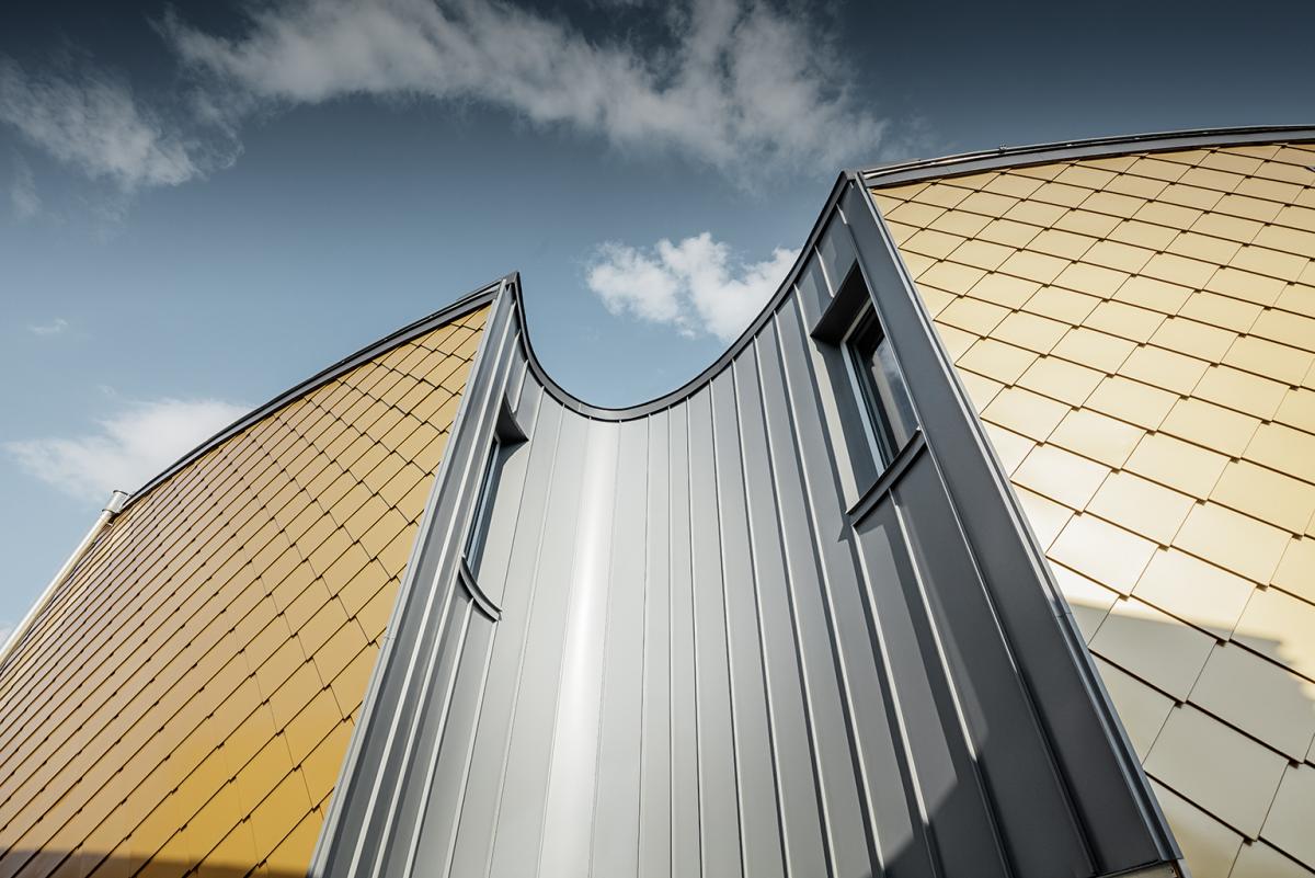 Az íves homlokzatot díszítő PREFA mayagold színű homlokzatburkoló lapok és a tagolt tetőt fedő PREFA korcolt lemezei kifejezetten izgalmas és látványos egységet alkotnak a tradicionális téglaburkolattal. A nyeregetőre került korcolt lemez minősége és gyártási technológiája lehetővé tette a tető keskeny sávos, 58 centiméterenkénti felosztását, míg az alumínium anyag könnyedsége és formálhatósága elengedhetetlen volt az épület íves homlokzatának elkészítéséhez.